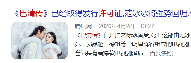 已经2年多没有新剧播出的范冰冰,急需一部电视剧来稳固市场,主演的《巴清传》则是她手上唯一的电视剧存货。