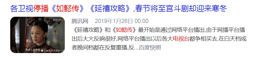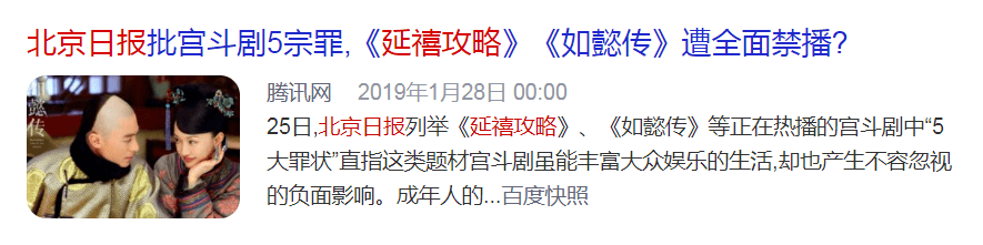 到了2019年1月25日,官方媒体《北京日报》发声:直言《延禧攻略》《如懿传》等宫廷剧霸屏造成了5大负面影响。