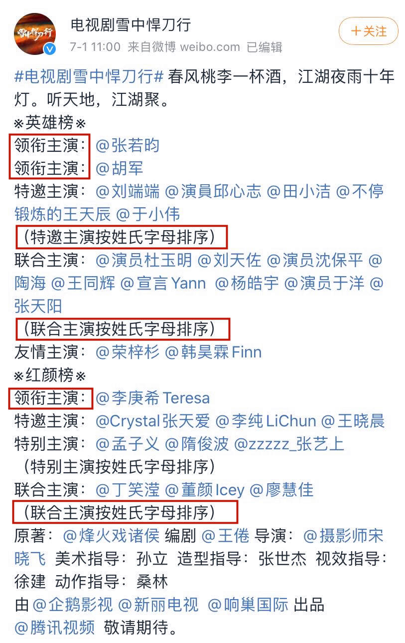 除了《你是我的荣耀》,《雪中悍刀行》剧方宣传人员也想方设法杜绝了番位之争:在宣传及排名上,写清楚了谁是什么身份,且排名按照演员姓氏字母排序。所以,这样明明白白的《雪中悍刀行》,也暂时没有发生番位大战。