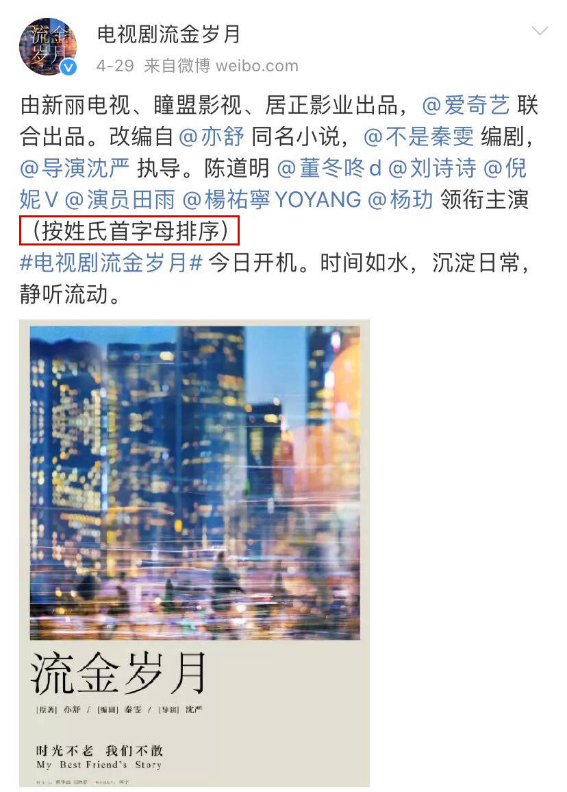 电视剧《流金岁月》本就是双女主的设置,但双女主也有双女主的烦恼,毕竟谁的名字写在第一位也很困扰,一个不小心就能让粉圈粉丝提着棍子赶来……!而该剧剧方为了保住小命,维护互联网和平,于是,在宣传上,只要涉及排名,都加上一句"按演员首字母排序"。真是忍不住给以上宣传人员点赞,这得想几个夜晚才能想出来呀!愁秃了头。