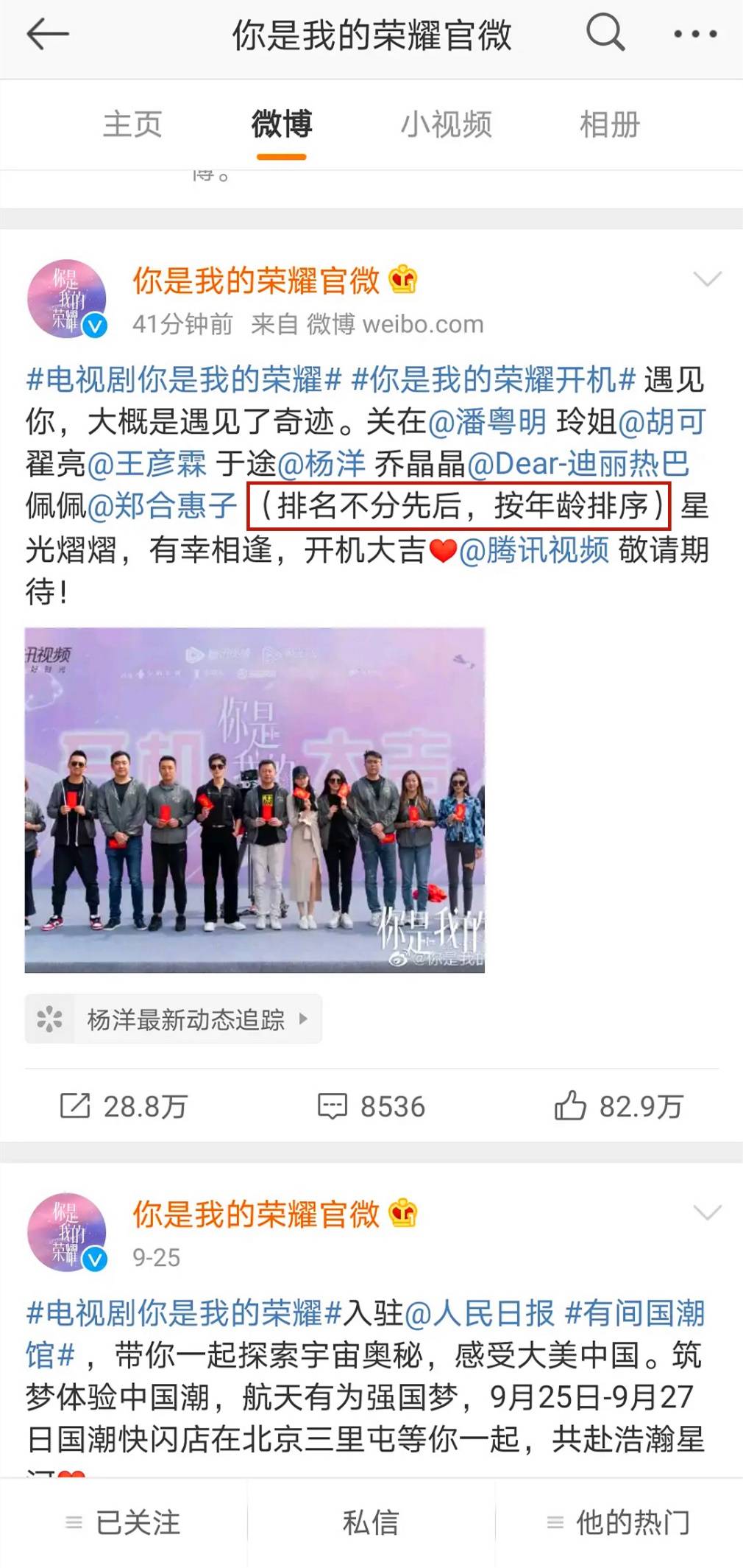 但办法总比困难多!近日,杨洋、迪丽热巴这两位流量演员主演的《你是我的荣耀》正式开机,剧方也开始进行宣传了。然后,剧方为观众们献上了最新端水方法:抛开番位,排名按演员年龄排序!就连该剧官博关注演员的先后顺序,也都是按照年龄来的,还真是个端水小达人呢!这一下子,乐坏了吃瓜网友们,而粉圈一时间竟也无法下手去撕番。