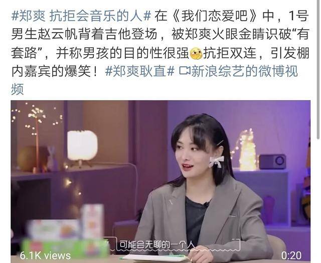 果不其然,《我们恋爱吧》这档节目才开播第一期,郑爽就凭借在节目中的发言上了两个热搜。言语之间,似乎还内涵了两位前男友。在看到男嘉宾背着吉他走来的时候,郑爽第一个发言表示自己很抗拒这种,这很明显就是带着目的来的,目的性太强。黄圣依问她:所以你很抗拒嘛?抗拒这种会音乐的人?郑爽毫不犹豫的回答表示自己很抗拒。可是,她的前男友之一的胡彦斌不就是做音乐的吗?