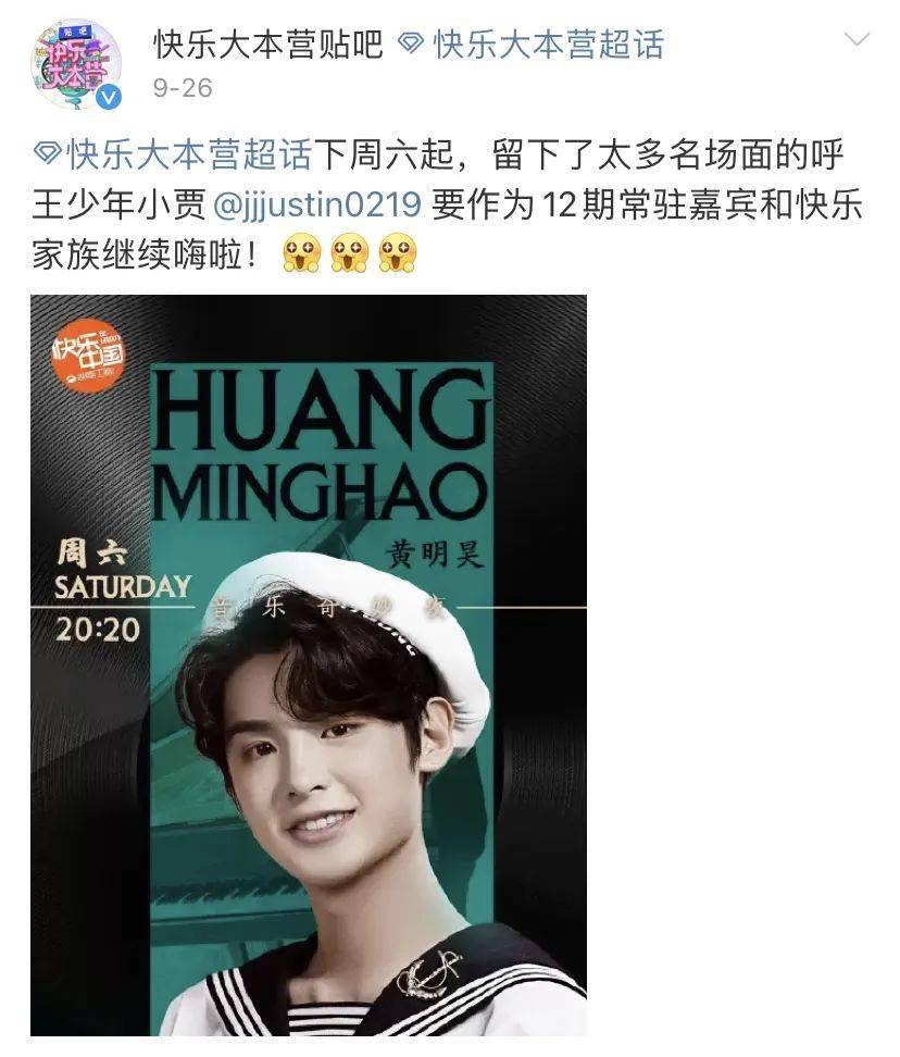 在最新一期的节目结束后,《快乐大本营》宣布黄明昊要作为12期常驻嘉宾和快乐家族继续嗨啦!