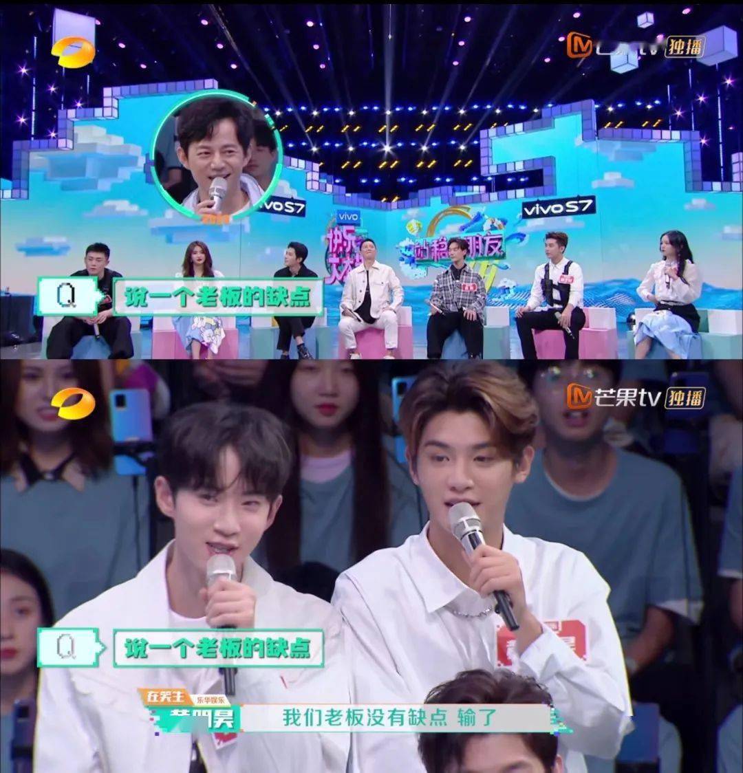 何炅让大家说出一个老板的缺点,黄明昊快速反应:“我们老板没有缺点,我们输了。”
