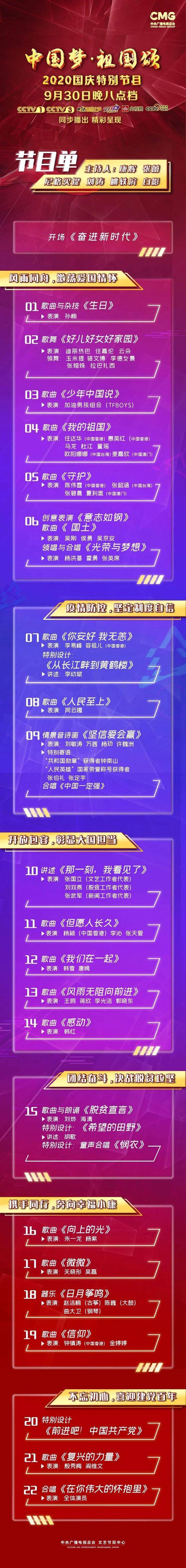 中央广播电视总台《“中国梦·祖国颂” ——2020 国庆特别节目》今晚8点于CCTV-1、CCTV-3、音乐之声、文艺之声、央视频、央视网同步播出。