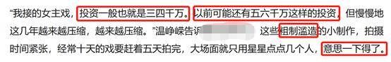 对于这个问题,温峥嵘也在之前的采访中谈到过。她称自己以前的女主戏可能还有"五六千万"的投资,而后来投资额度降低,一般"也就三四千万"。还表明慢慢地拍戏越来越时间紧张,也变得"粗制滥造"。