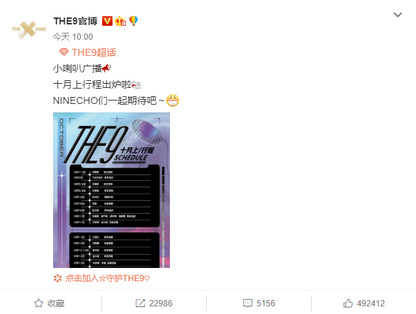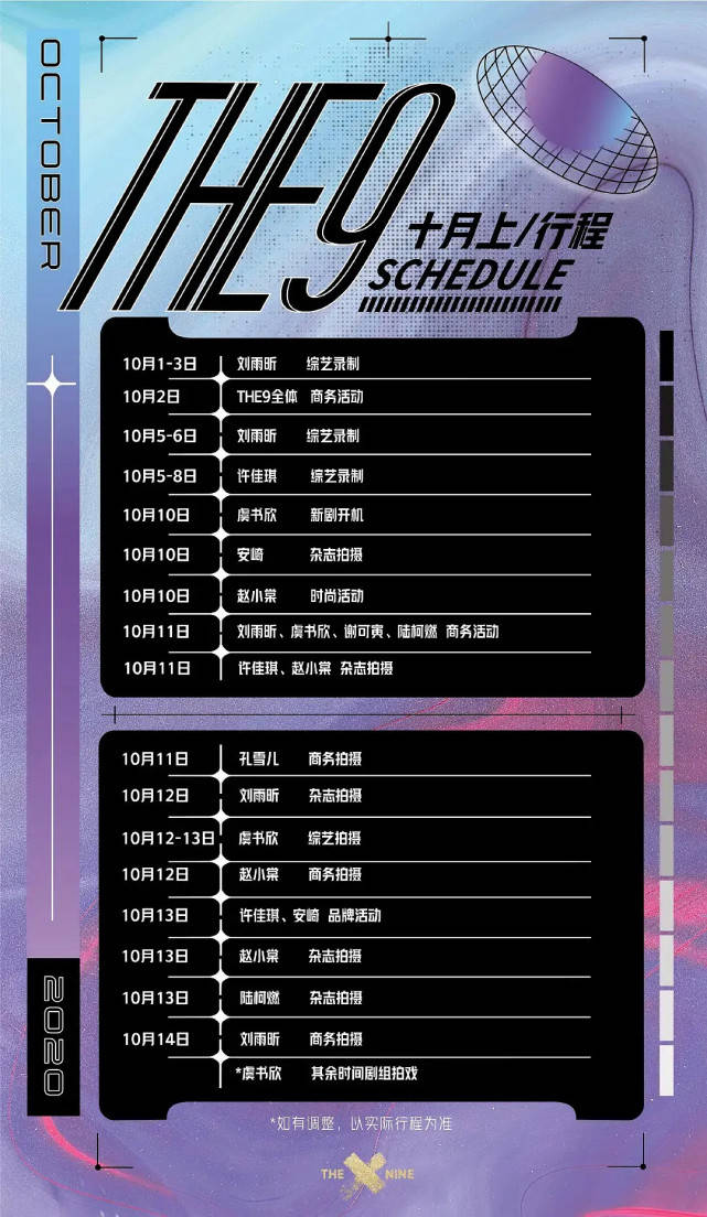 央视删除了喻言镜头,似乎也是对喻言这种失格艺人的表态。镜头被删后,网友也猜测喻言会不会被雪藏,毕竟主流媒体的态度摆在那里,公司继续大张旗鼓宣传喻言的可能性不大。就在网友们猜测喻言到底会不会被雪藏时,THE9团体的行程图似乎也释放出了一点信息。9月30日,THE9官博晒出了成员们的10月行程图。不管是杂志拍摄还是商务活动,成员们的行程日期都安排的清清楚楚,资源分配看着也比较合理