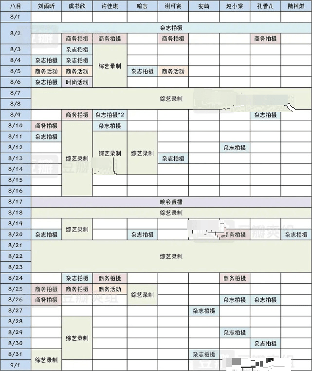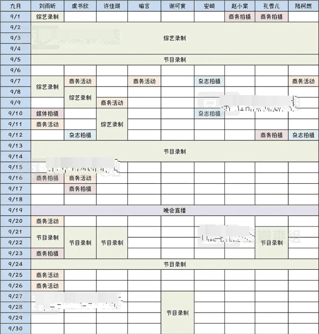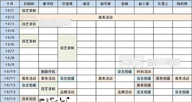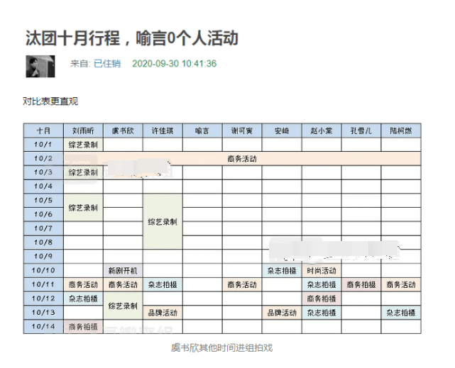 不过就在这张看似公允的行程图中,还是有细心的网友发现了问题。其他成员大小活动都有安排,只有喻言的个人活动为0。为了让网友们看得更加直观清晰,该网友还专门做了表格图。在团体活动表格图中,喻言那一列空空如也,唯一的一个行程还是2号的团体活动。虽说喻言此前的资源比其他成员虐,但也不至于一个都没有。而这次被央视删除镜头后,10月行程竟然0个单人活动,这让网友们也不禁猜测喻言要被雪藏。