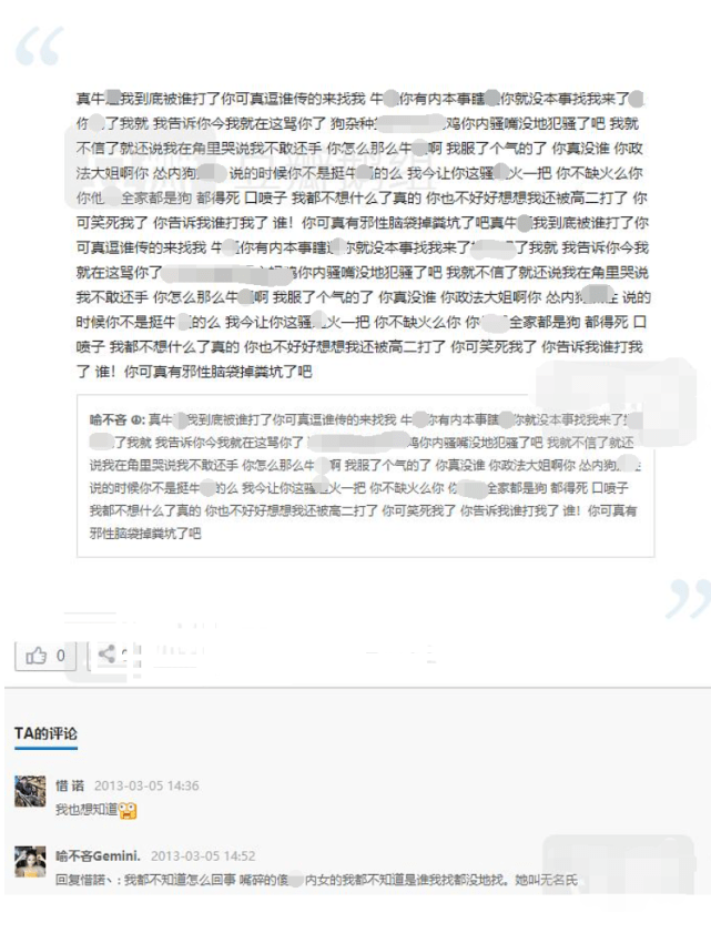 不过喻言过往的精彩不止浮于表面,有些言论和思想更加毁人三观,完全是个不折不扣的问题少女。打着叛逆放纵的旗号,喻言在社交平台上肆意抒发情绪,满篇脏话的帖子马赛克都打不过来。爆粗口是常态也就罢了,还被网友扒出了一系列毁人三观的言论,譬如“不要暗恋,追不上就下药”等侮辱女性言辞。不仅侮辱女性,喻言还教外国猛男用中文骂人,言辞的肮脏程度也是让不少网友大跌眼镜。