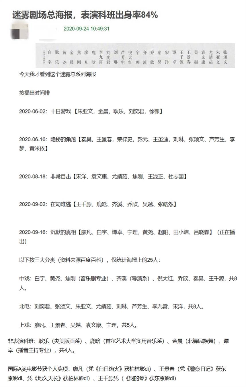 早前,爱奇艺曾发布过一张"迷雾"阵容总系列海报,该海报汇集了迷雾剧场的各个剧集主演。有网友根据海报上的25位演员做了统计,发现这些演员里,表演科班出身率为84%。该网友将这些演员的出身分成四类,分别是中戏、北电、上戏还有非表演科班。