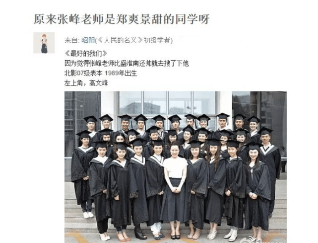 在毕业合照里,郑爽与高文峰就一前一后相邻而站,那时候的郑爽还十分青涩,但依然能看出在一众女同学中颜值出众。