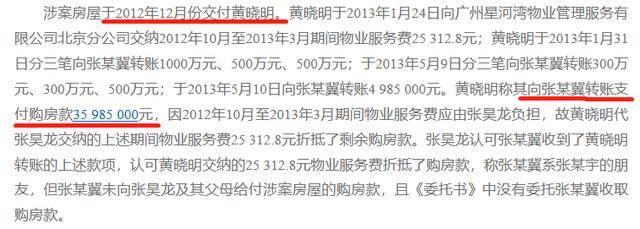 房子交付给黄晓明后,黄晓明分3次,共7笔向张某冀转了一共35985000元,剩下的25000块用物业费抵扣,至此黄晓明一共花了3600万。