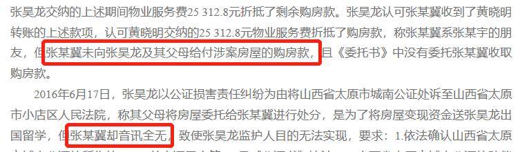 张某冀消失后,张某龙一家向法院提起上诉,但只拿到了公证处赔偿的5万元。而张某龙父母最初卖房子是为了送张某龙去留学。在多次上诉中,这所价值3600万的豪宅被4次查封,其中有一次是黄晓明为了财产保全,主动申请查封。