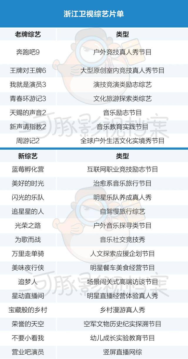 综艺方面,除《奔跑吧》、《王牌对王牌》等还将继续新一季制作外,浙江卫视也将推出大量新节目,比如有4档音乐类节目,分别是《美好的时光》、《闪光的乐队》、《光荣之路》、《为歌而战》,还有2档直播类节目《营业吧演员》(我就是演员衍生节目)、《星动直播间》。另外,还有邀请到了前故宫博物院院长单霁翔的人文类节目《万里走单骑》、关注空军文物历史的《荣誉的天空》等。