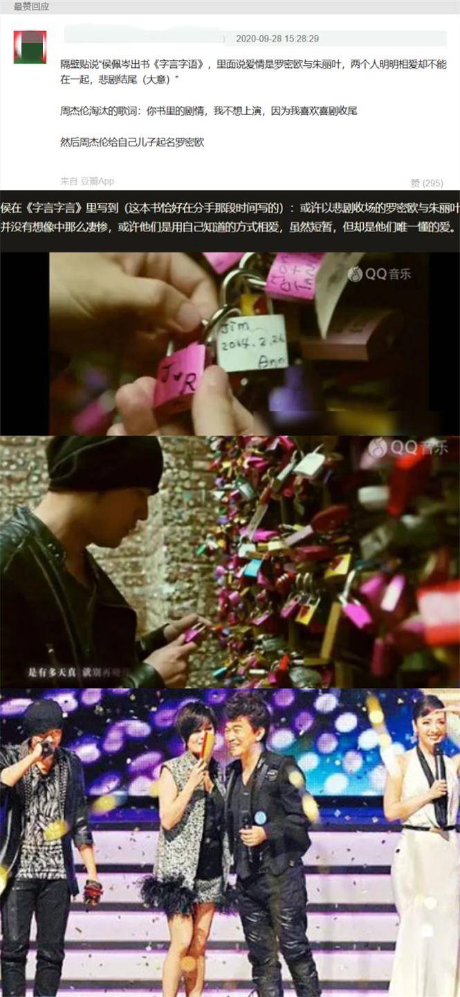 而周杰伦,除了这事之外,还被网友扒出不少不知道是巧合还是有意为之的"骚操作"。众所周知,周杰伦与昆凌的儿子叫做"罗密欧",可有网友认为,这跟侯佩岑也有千丝万缕的联系。该网友说,侯佩岑与周杰伦分手后,曾出过一本叫做《字言字语》的书,书中提到罗密欧与朱丽叶,说他们两个人明明相爱却不能在一起,最后以悲剧结尾了。而周杰伦的歌曲《淘汰》,又有这么一句歌词"你书里的剧情,我不想上演,因为我喜欢喜剧收尾"。