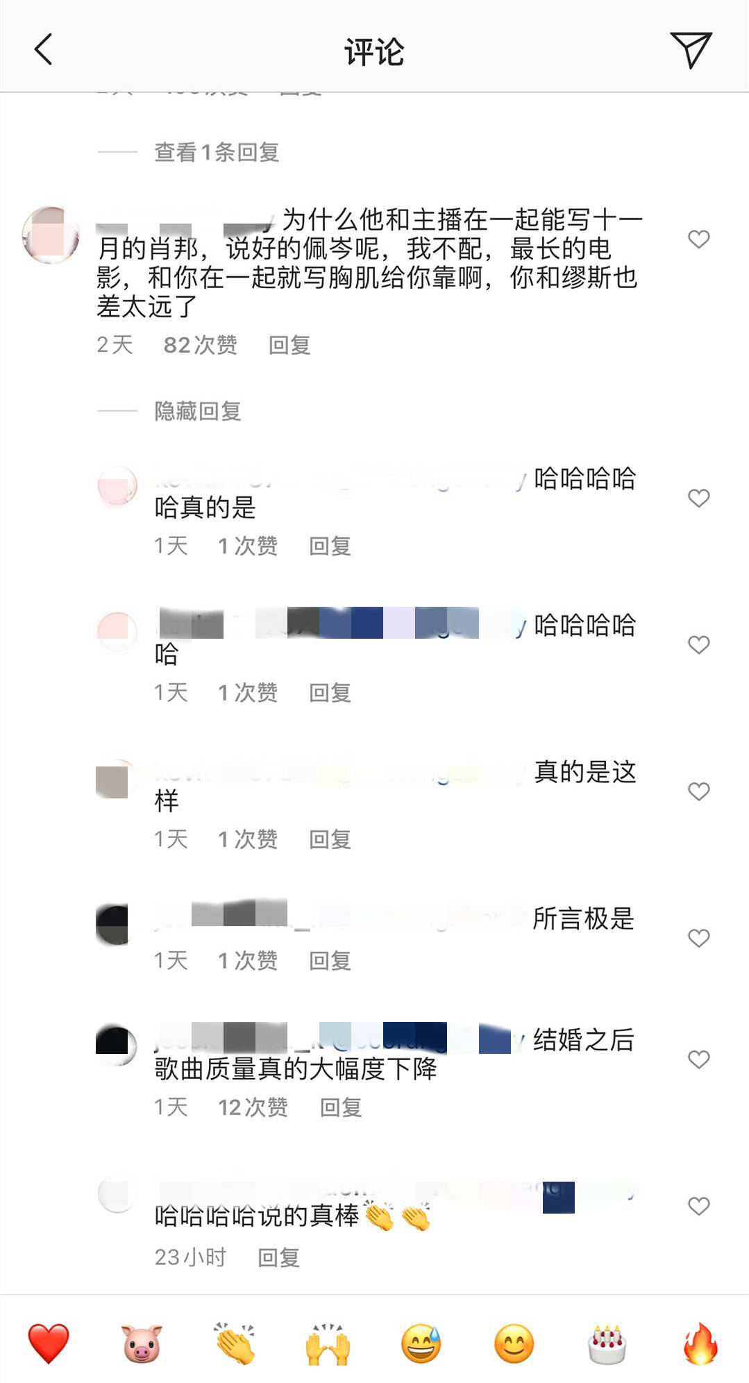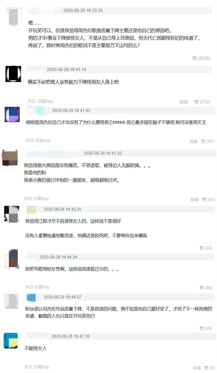 就曾有网友去昆凌的评论区留言,说"为什么他和主播在一起能写十一月的肖邦,说好的佩岑呢,我不配,最长的电影,和你在一起就写胸肌给你靠啊?你和缪斯也差太远了"。这条评论引得不少网友哈哈大笑,但也有网友认为此举做得不对,认为普通调侃开玩笑可以,但不能把周杰伦歌曲质量下降的原因全部归咎于昆凌。