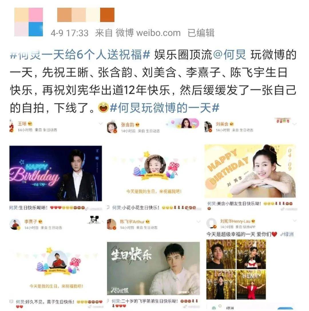 娱乐圈常青树、端水大师何老师也曾经在4月9日一天内给王晰、张含韵、刘美含、李熹子、陈飞宇六个人送上了生日祝福