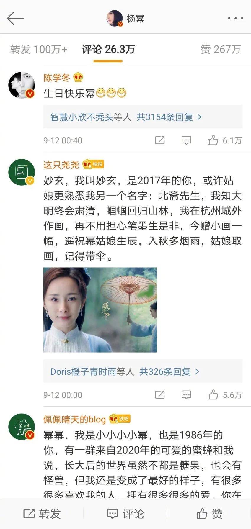 例如杨幂生日的微博底下粉丝用她饰演过的角色组成了生日祝福