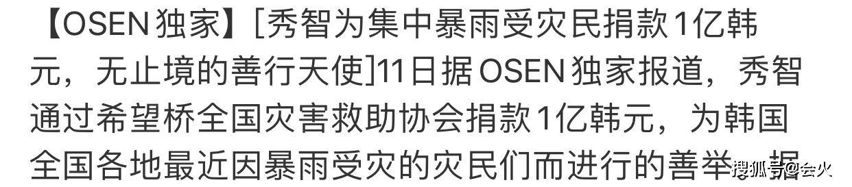 裴秀智的收入高,做起公益来也毫不吝啬。她多年来一直非常热心慈善事业,每年都有给公益项目捐赠的款项。此前,她还为韩国因暴雨受灾的灾民们捐款1亿韩元,她的善举也受到了各方的称赞。