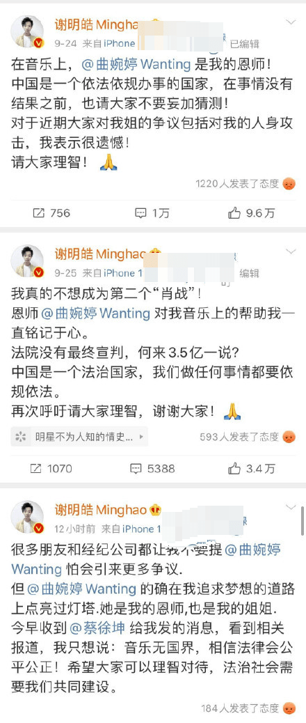 众所周知,前两天圈内歌手曲婉婷因为在微博上发文再谈母亲涉嫌贪污案而受到吃瓜群众的热议,甚至官媒都表了态,可想而知此事网络上引起的热议有多大。或许也正是因为如此,谢明皓就开始在微博中发文表示曲婉婷是自己的恩师,希望大家嘴下留情,还在文末表示因为自己维护曲婉婷遭到了不少无妄之灾。