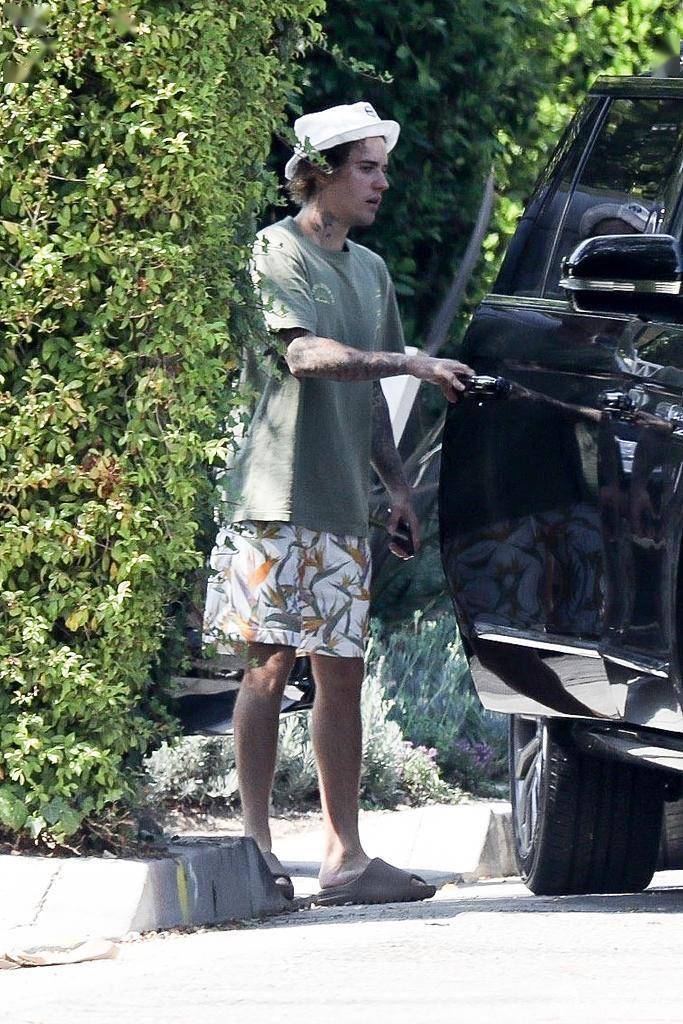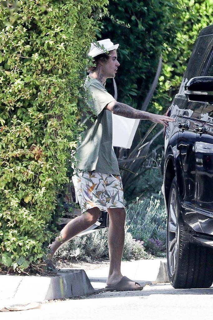 照片拍摄地点是好莱坞富豪住宅区比弗利山庄。只见比伯头戴白帽子,穿着灰绿色上衣和印花短裤,脚上踩着拖鞋,朴素的造型显得邋遢。
