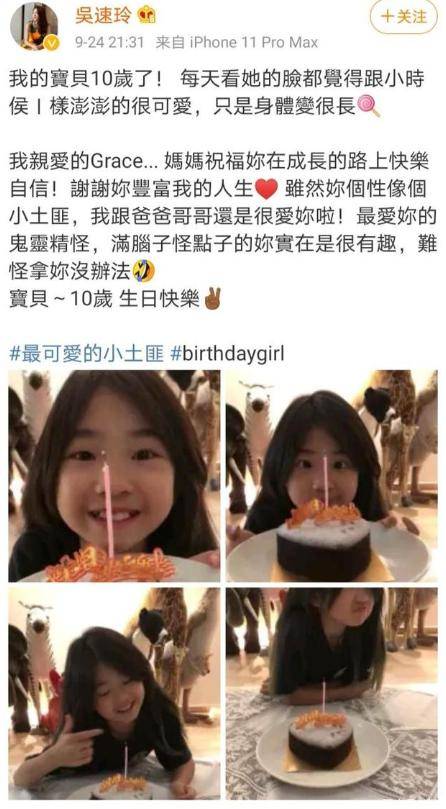 前段时间,曹格妻子吴速玲在微博上发文庆祝了女儿grace的十周岁生日,并配文:"祝你在成长的路上快乐自信!谢谢你丰富我的人生,虽然你个性像个小土匪,我跟爸爸哥哥还是很爱你啦!"