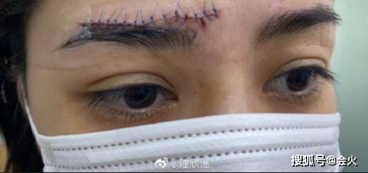 照片中,阿娇的伤口触目惊心,缝线痕迹清晰可见,差一点就伤到了眼睛。