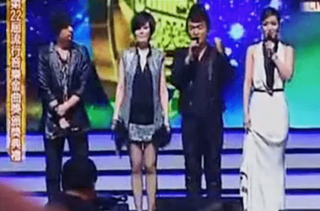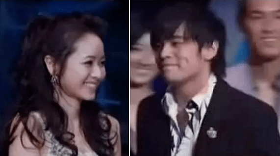 周杰伦因《头文字D》获得新人奖,两人在舞台上对视甜笑。