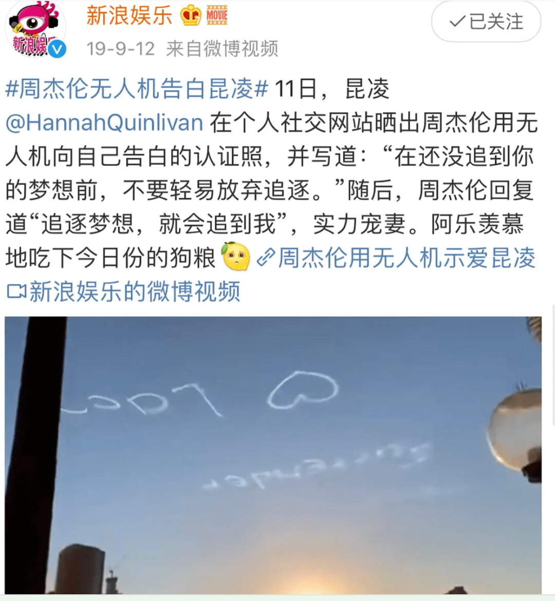 因为这次图片翻车,不少网友发现,去年昆凌也在ins上发了一张图片,之后媒体纷纷发帖说这是周杰伦为昆凌准备的无人机告白,给大众狠狠塞了一把狗粮。