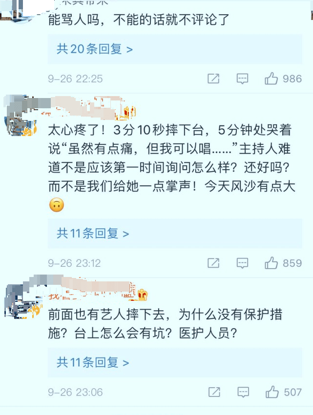 黄龄前面的表演很顺利,网友推测可能是舞台设置出现漏洞,导致黄龄没看到地面的“大洞”,边走边唱就摔了下去。