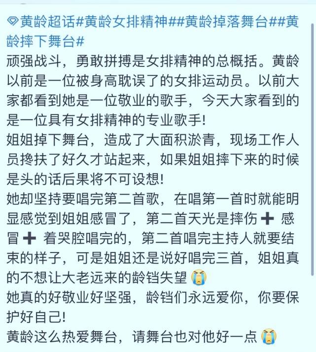大约过了一分多钟,工作人员确认黄龄没有严重受伤,而她本人希望继续演出,主持人就宣布黄龄再度出场,令网友最心酸的是,黄龄一开口不是说自己的伤势,而是哭着向观众道歉,“对不起,我只想离观众更近一点”。