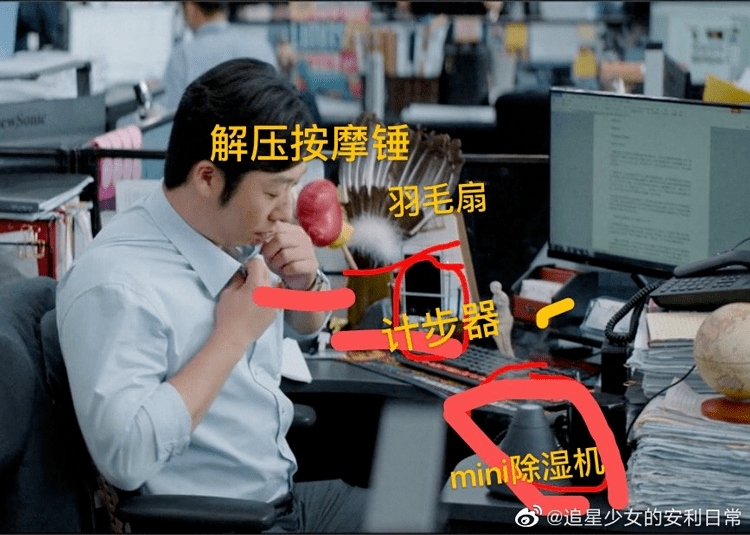 为了把每个细节打造到最真实,工作人员和演员都非常用心。比如老员工的工位上堆满了各种资料和办公室神器,按摩锤、除湿机、养生茶应有尽有。