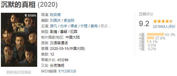 在豆瓣平台,《隐秘的角落》的评分为8.9分,而《沉默的真相》则拿下了9.2的高分,五星好评占比高达65%,评分人数已超20万人。
