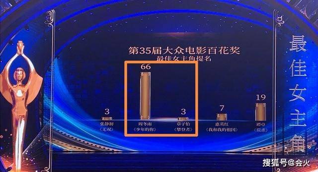 周冬雨凭借饰演《少年的你》中的"陈念"而获得最佳女主角,最终得票数是66票,大幅领先章子怡等其他候选人,这也是周冬雨获得的第五个影后。她登台发表感言:"很多人说我只能演中学生,但我特别欣慰,如果观众喜欢,小学生我也能演。"