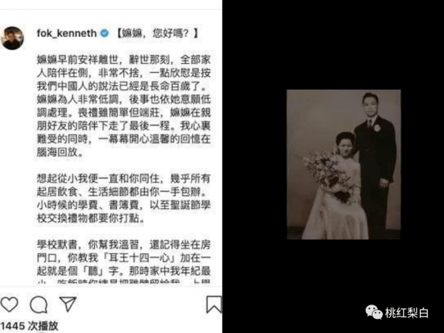 霍启刚还在社交媒体上发文纪念吕燕妮,感叹:“按照我们中国人的说法已经是长命百岁了。
