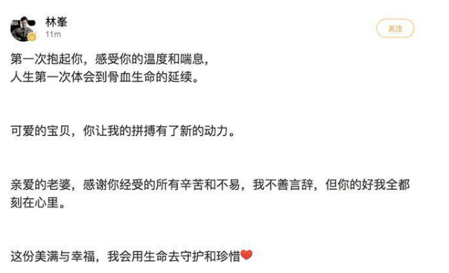 九月二十六日,林峯在微博上分享喜讯妻子张馨月为他生下了一个儿子。
