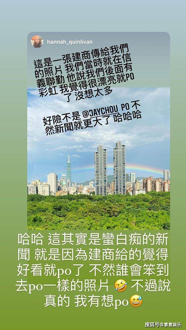 昆凌表示这一次撞图的事件,其实是建筑商传出自己工作室的,单纯的只是觉得大楼的背后有彩虹,所以就PO出来了。真的没有想太多,而且昆凌还表示幸福的是不是周杰伦发出来的,不然新闻就更大了。