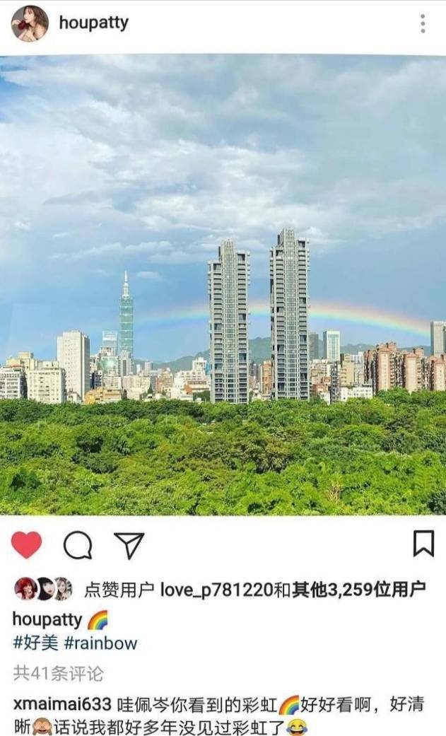 随后这张照片却引起热议,原来被细心网友发现,这张照片和7月份侯佩岑在社交平台上发布过的一模一样,关键是……粉丝说这张彩虹图是侯佩岑在自家豪宅的阳台拍摄的。昆凌被认为盗用图片,特意编辑加滤镜,并配上a little getaway,假装自己在旅游?吃瓜群众们表示这操作,活久见啊。