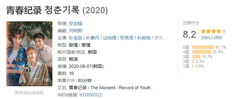 《青春记录》由朴宝剑、朴素丹、边佑锡主演,《秘密森林》《阿尔罕布拉宫的回忆》安吉镐导演执导,《Doctors》《爱情的温度》河明熙编剧执笔,2020年9月7日起在tvN月火档播出。
