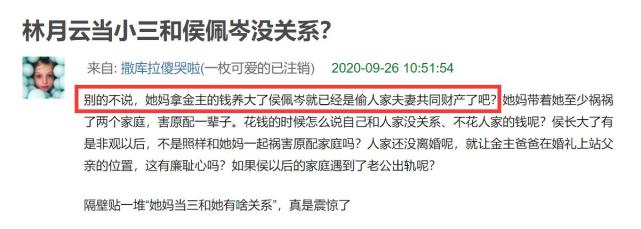 9月26日,不少网友再次把侯佩岑妈妈林月云是小三的陈年历史挖了出来,字里行间无不透露出对侯佩岑出身的厌恶、反感。虽说林月云当小三与侯佩岑的关系并不大,但她的行为确实对侯佩岑今后的人生发展、价值观构造造成一定的影响。更有网友犀利评论道:“她妈拿金主的钱养大了侯佩岑就已经是偷人家夫妻共同财产了吧?”可见,其实大多网友都认为侯佩岑的出身极其不光彩。