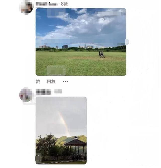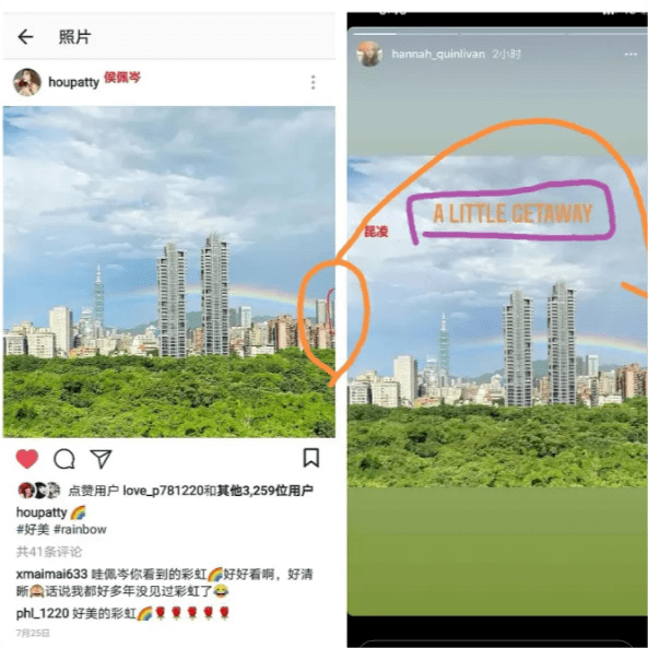 不仅如此,对比侯佩岑此前在社交平台分享过的照片,不难发现拍摄彩虹图的角度为她家阳台外的视角,这也说明侯佩岑是在自己家拍下的这张照片。加上昆凌和侯佩岑分享照片的社交平台不能直接保存图片,只能通过截图获得,所以画质上会有一定受损。通过对比两者发过的图片,可以看出昆凌的比较模糊,照片的最右边还缺失了一点。