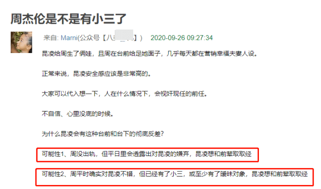 然而昆凌为何还会做出窥探老公前任动态的行为,并堂而皇之把照片分享出去?这难免会让人感觉昆凌不自信、没底气。该网友还补充了可能造成昆凌会有这种想法的原因:要么周杰伦没有出轨,但平日里表现出对昆凌的嫌弃,所以她才会打算向前辈取经;要么周杰伦平日对昆凌不错,但已经有了小三,或者是暧昧对象,所以昆凌想和前辈取经。