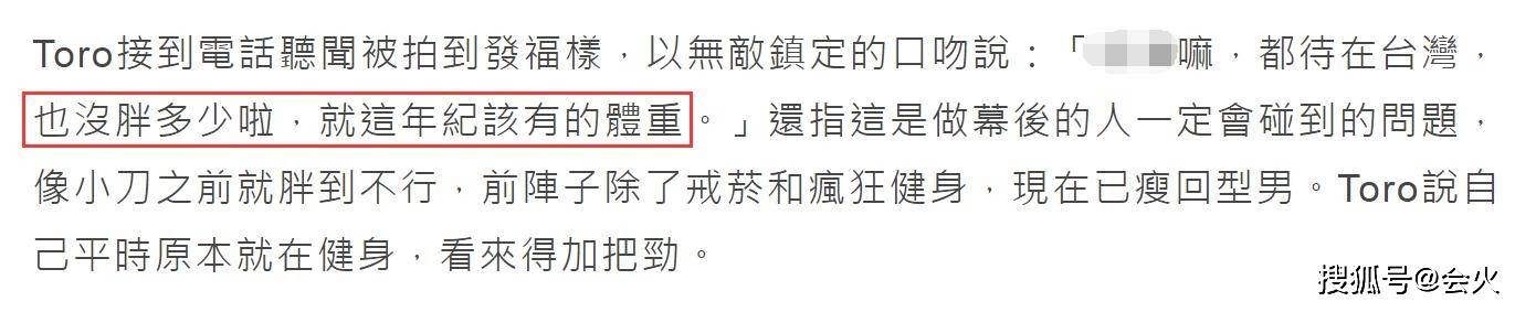 距离上次露面时间仅隔半年,toro的身材状态却出现明显走样,有台媒特地联系到toro,对于发福质疑toro似乎完全不以为意,回应称他其实并没胖多少,无非就是这年纪该有的体重罢了。