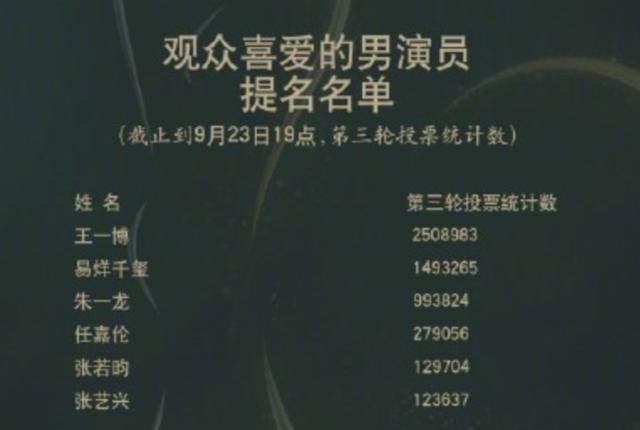 相比之下,排在第一名的王一博,他身为演员的职业生涯就难看多了。王一博不管是第一轮投票还是第二轮、第三轮,票数一直稳居第一,甩下其他五名同样被提名的男演员好大一截儿,甚至可以说是断层第一。
