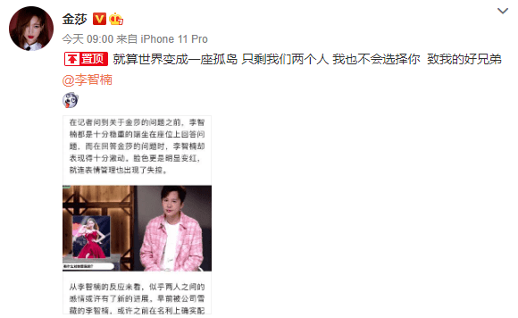 蓝菲琳,啊不是,金莎,最近在刷手机的时候看到有媒体报道说,李智楠被问到关于金莎的问题时会脸红害羞,疑似两人有新进展,金莎直接就辟谣了,说大家都是兄弟。