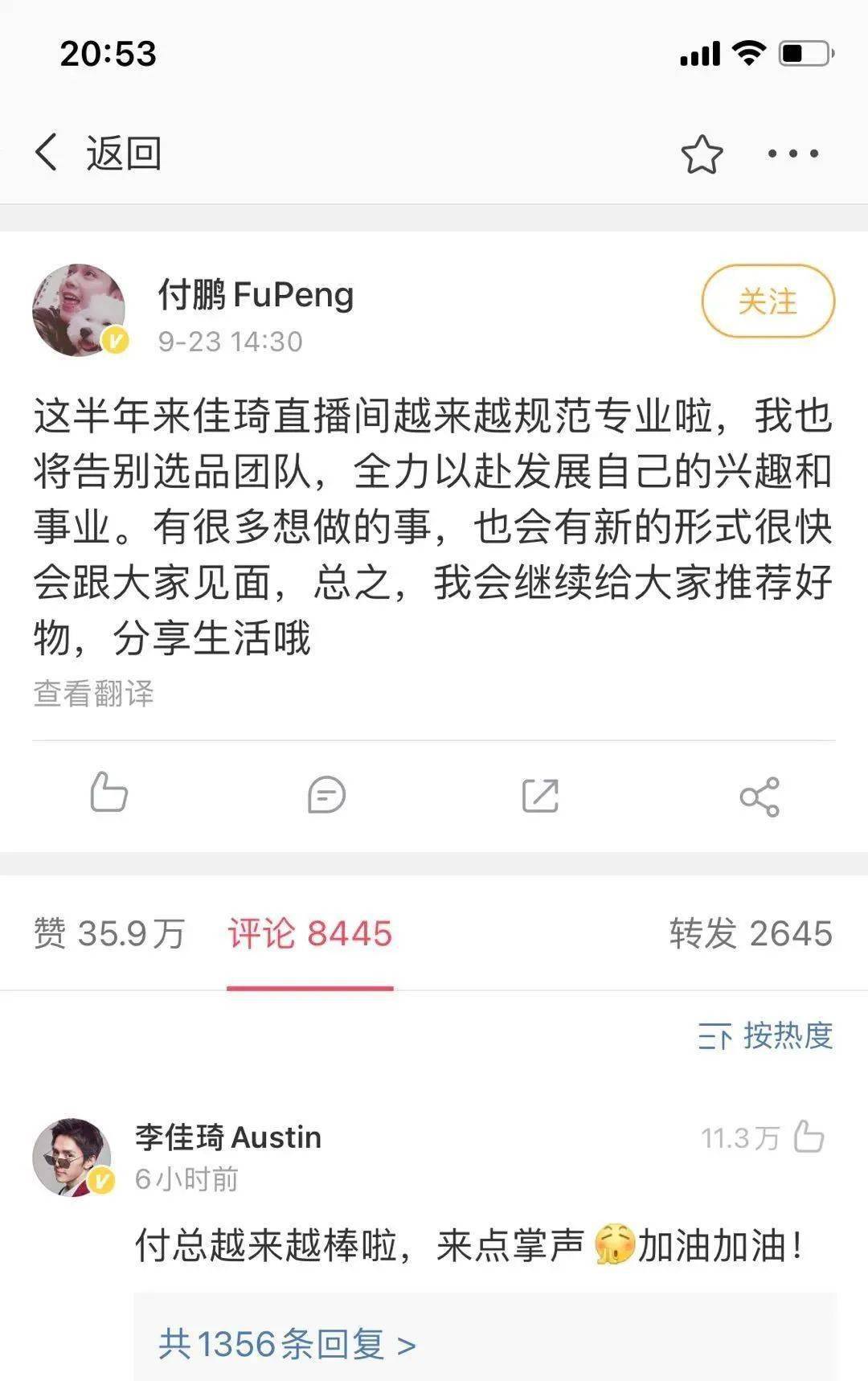 桃仔有话说:小助理已经从当年的小助理,变成了现在的付总,他自己本身也有人气,开直播什么的完全没有问题,要走也是理所应当。