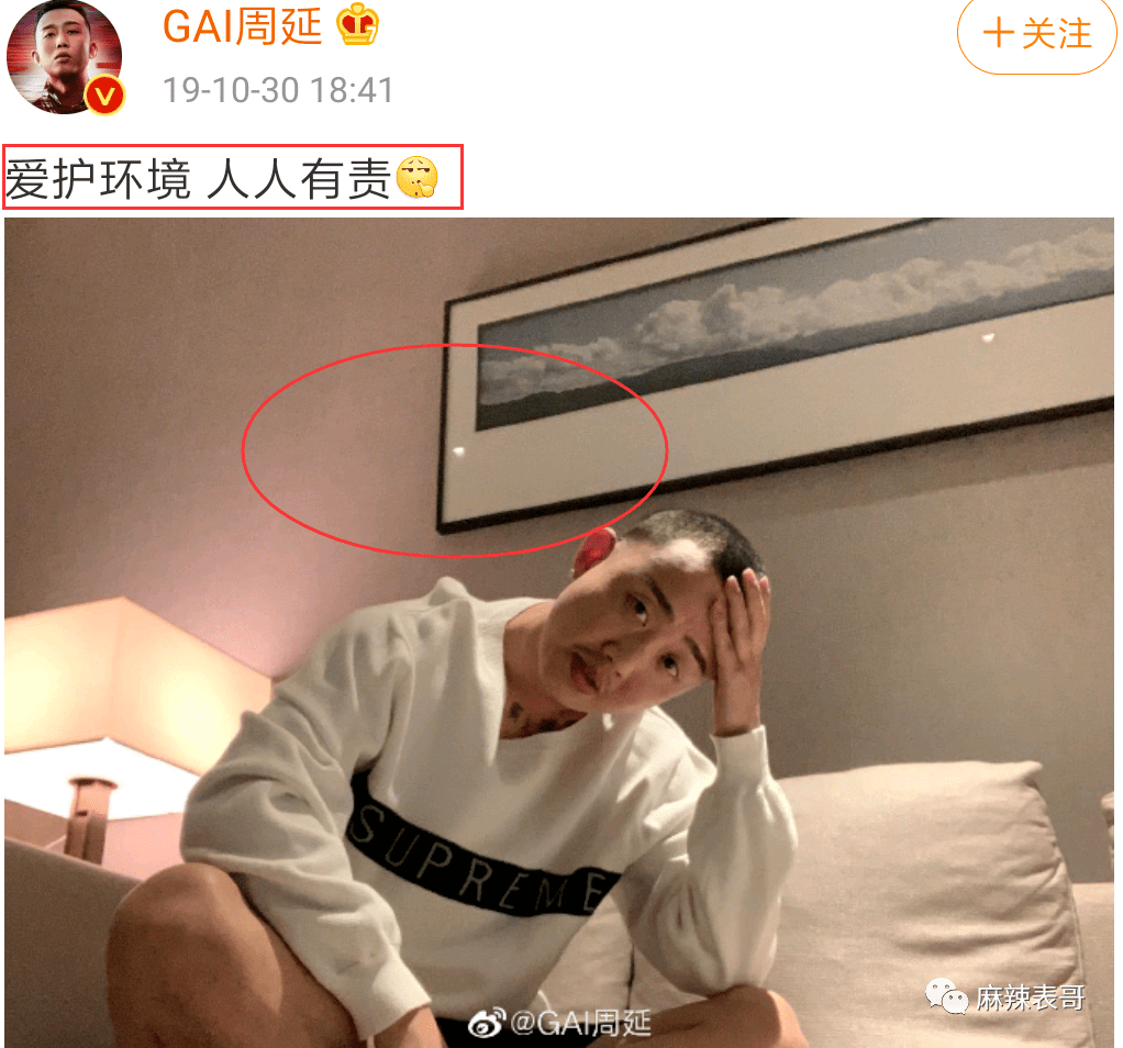 曾经和pgone有过旧仇的Gai,出来发了同一个背景的照片,配文“爱护环境,人人有责”。