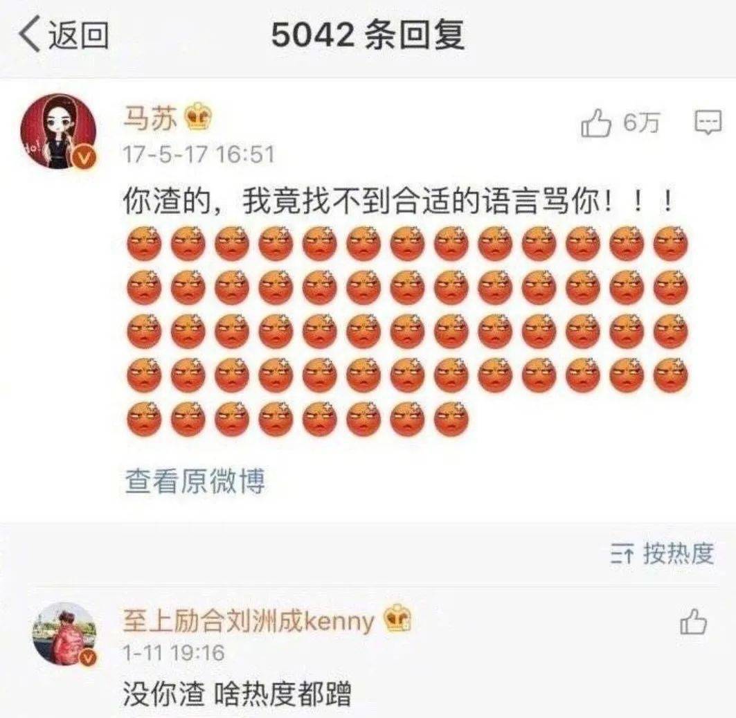 两人的梁子就结在当年刘洲成被爆家暴吃会,马苏留言“渣男”,而后马苏李小璐事件刘洲成留言“痛吗?摸摸头”