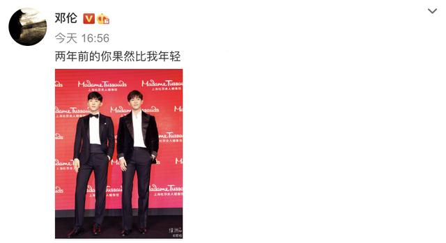 9月25日,邓伦分享了自己和蜡像的同框照,并喊话自己的蜡像:两年前的你果然比我年轻!