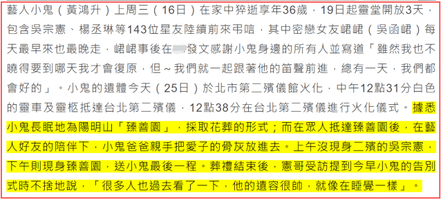 吴宗宪还向媒体描述了黄鸿升遗体火化前的最后模样,表示遗容状态很好:“很多人也过去看了一下,他的遗容很帅,就像在睡觉一样。”看来黄鸿升走得十分安详,最后离开的样子就像是在睡觉一般。